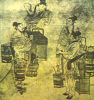 元代書畫家趙孟俯的《斗茶圖》,是一幅充滿生活氣息的風(fēng)俗畫。畫面有四個人物,身邊放著幾副盛有茶具的茶擔(dān)。左前一人,足穿草鞋,一手持茶杯,一手提茶桶,坦胸露臂,似在夸耀自己的茶質(zhì)香美。身后一人雙袖卷起,一手持杯,一手提壺,正將茶水注入杯中。右旁站立兩人,雙目凝視,似在傾聽對方介紹茶的特色,準(zhǔn)備回?fù)?。圖中,人物生動,布局嚴(yán)謹(jǐn)。人物模樣,不似文人墨客,而像走街串巷的貨郎,這說明當(dāng)時斗茶已深人民間。