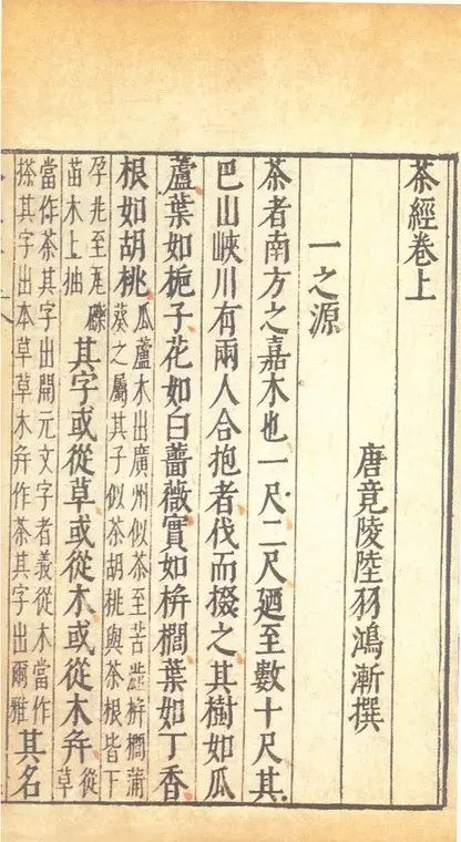 《茶經》成為世界上第一部茶學專著,是陸羽對人類的一大貢獻。全書分上、中、下三卷共十個部分。其主要內容和結構有:一之源;二之具;三之造;四之器;五之煮;六之飲;七之事;八之出;九之就;十之圖。