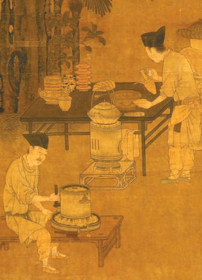 根據(jù)《茶錄》和《大觀茶論》復(fù)原的點茶程序,比制茶程序還多。首先對茶進(jìn)行處理,要炙茶,即烤茶。然后是用砧椎椎茶,把茶放進(jìn)木臼中初步搗碎。接著用茶碾碾茶,用石磨磨茶,進(jìn)一步細(xì)化,接近面粉的細(xì)度。