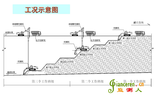 2)基坑開挖分段長度、分層厚度及支錨設(shè)置是否與設(shè)計要求一致;