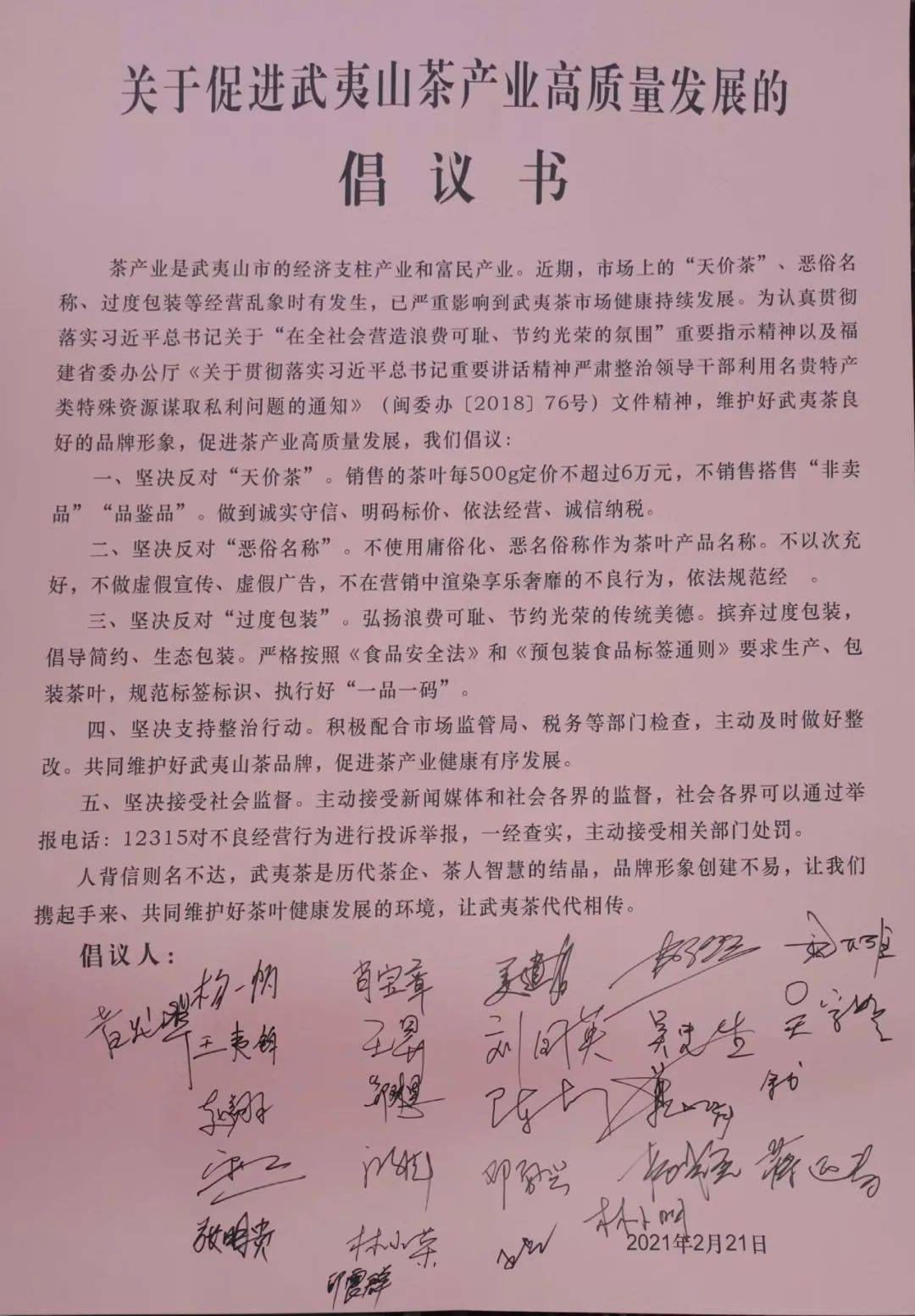 2月21日下午,武夷山市召開促進茶葉市場健康發(fā)展推進會,26家曾出現(xiàn)在網(wǎng)傳“天價茶”榜單上的武夷山茶企負責人共同簽署《關于促進武夷山茶產(chǎn)業(yè)高質(zhì)量發(fā)展的倡議書》,堅決反對“天價茶”,堅決反對“惡俗名稱”、“過度包裝”,承諾不做虛假宣傳,規(guī)范經(jīng)營管理,不銷售“非賣品”“品鑒品”,自覺接受監(jiān)督,如有違法違規(guī)行為,一經(jīng)查實,主動接受相關部門處罰。
