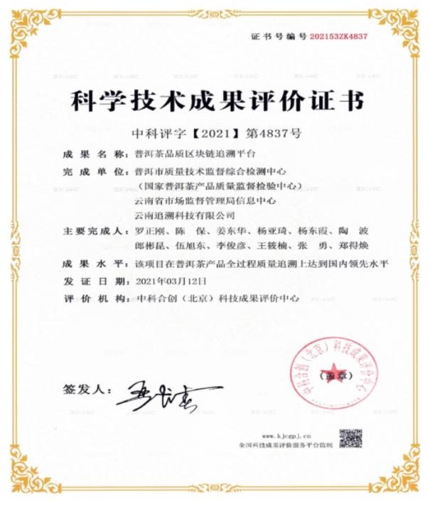 日前,第三方專業(yè)科技成果評價機(jī)構(gòu)依據(jù)科技部《科學(xué)技術(shù)評價辦法》,組織同行專家對國家普洱茶產(chǎn)品質(zhì)量監(jiān)督檢驗中心完成的“普洱茶品質(zhì)區(qū)塊鏈追溯平臺”項目科技成果開展評價。
