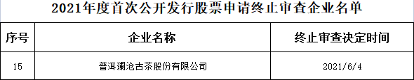 據(jù)中國證監(jiān)會網(wǎng)站6月11日消息,中國證監(jiān)會決定對普洱瀾滄古茶股份有限公司(以下簡稱“瀾滄古茶”)首次公開發(fā)行股票申請終止審查。