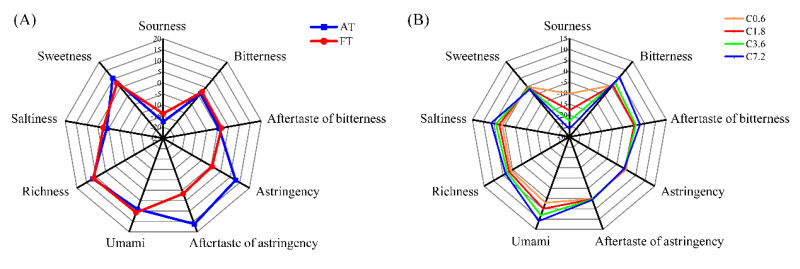 兒茶素,尤其是表沒食子兒茶素沒食子酸酯(EGCG)和表兒茶素沒食子酸酯(ECG)是茶葉苦澀味的最主要來源。秋茶經(jīng)冠突散囊菌PW-1發(fā)酵后,兒茶素總量從118.35 mg/g下降到10.58 mg/g,下降幅度達(dá) 91.06%;且發(fā)酵秋茶中酯化兒茶素EGCG和ECG的含量分別為0.37 mg/g和0.40 mg/g,表明菌株P(guān)W-1發(fā)酵可顯著降低秋茶中的兒茶素含量。通過電子舌技術(shù)對秋茶和冠突散囊菌PW-1發(fā)酵秋茶的滋味特征進(jìn)行分析,發(fā)現(xiàn)秋茶的澀味顯著降低而鮮味強度有所增加,表明秋茶經(jīng)菌株P(guān)W-1發(fā)酵后的滋味品質(zhì)得到顯著提高。此外,通過電子舌技術(shù)首次對茶褐素的滋味特征進(jìn)行分析,發(fā)現(xiàn)茶褐素?zé)o澀味而呈強烈的鮮味,為發(fā)酵秋茶中的主要呈味物質(zhì)。
